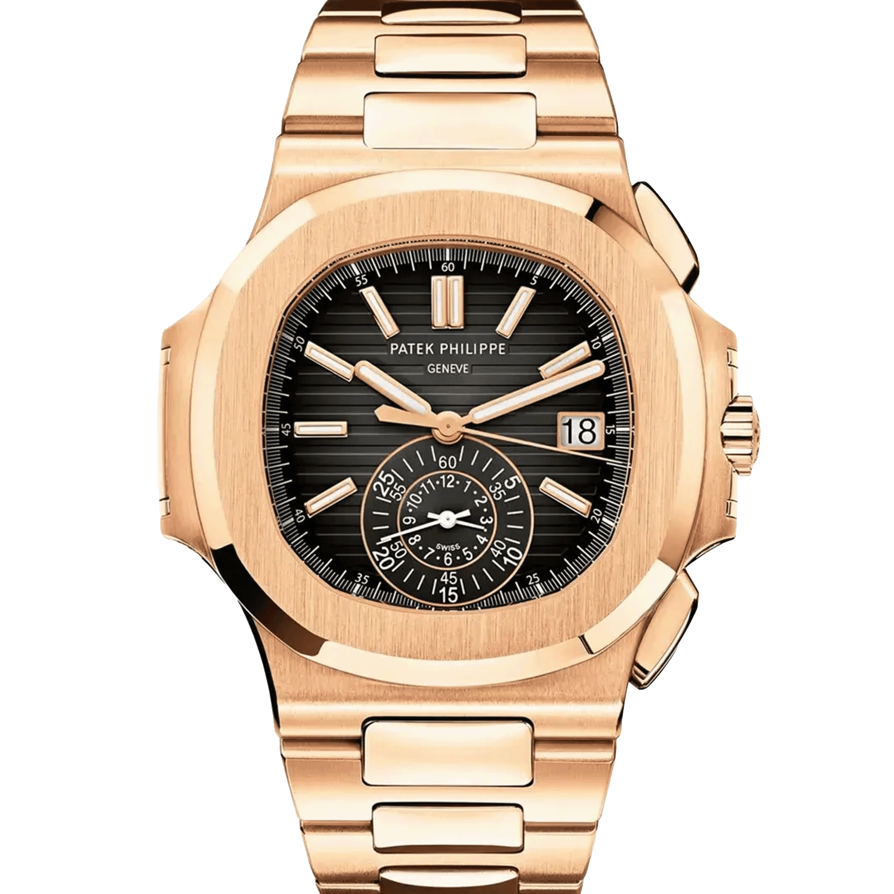 The Nautilus chronograph in rose gold is not the watch you buy to blend in. The 5980/1R, with its flyback chronograph and integrated bracelet, represents the sportier end of the Nautilus family while maintaining the elegance Patek Philippe is known for. At 40.5mm, it wears larger than the time-only references, and the black dial against warm rose gold creates a striking contrast. The CH 28-520 C movement features a column wheel and vertical clutch, along with a flyback function that allows instant chronograph reset without stopping. This 2020 example comes in excellent condition with box and papers. Discontinued variations of the Nautilus have historically performed well, and the 5980 in rose gold occupies a unique position: sporty enough for daily wear, refined enough for any occasion, and rare enough that you will not see another across the room.