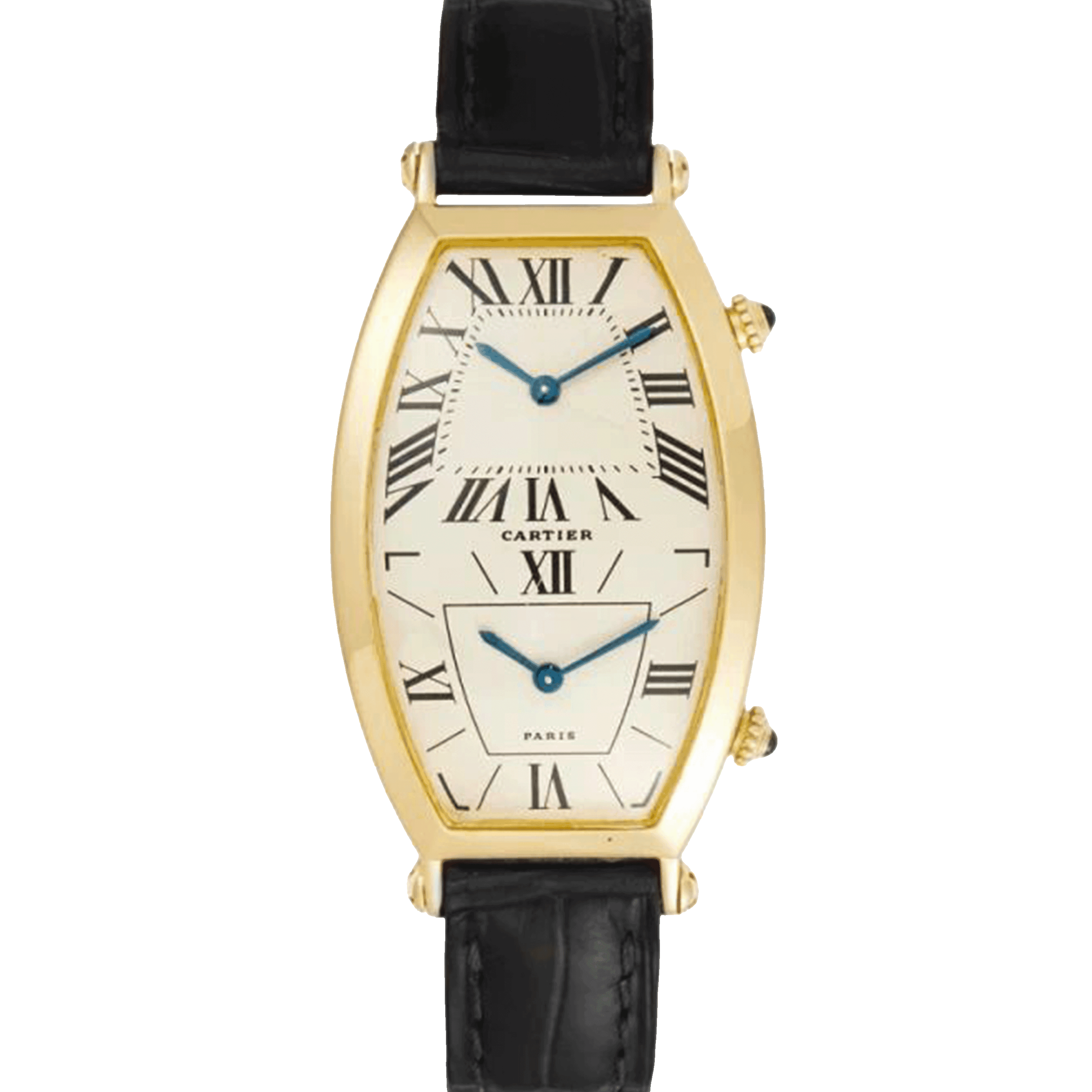 The Tonneau is one of Cartier's earliest watch designs, predating even the Tank. This dual-time version in yellow gold adds functionality to the elegant barrel-shaped case, allowing two time zones to be tracked simultaneously. At 26mm, it wears as Cartier intended: refined, understated, and unmistakably French. The silver dial features applied Roman numerals in the Cartier tradition, with separate subdials for each timezone. The quartz movement keeps both displays accurate without the bulk that a mechanical dual-time complication would require. Excellent condition with box only. The Tonneau has never achieved the commercial success of the Tank or Santos, which makes well-preserved examples all the more interesting to collectors who value distinction over popularity. This is the Cartier you wear when you already own the obvious choices and want something with deeper roots.