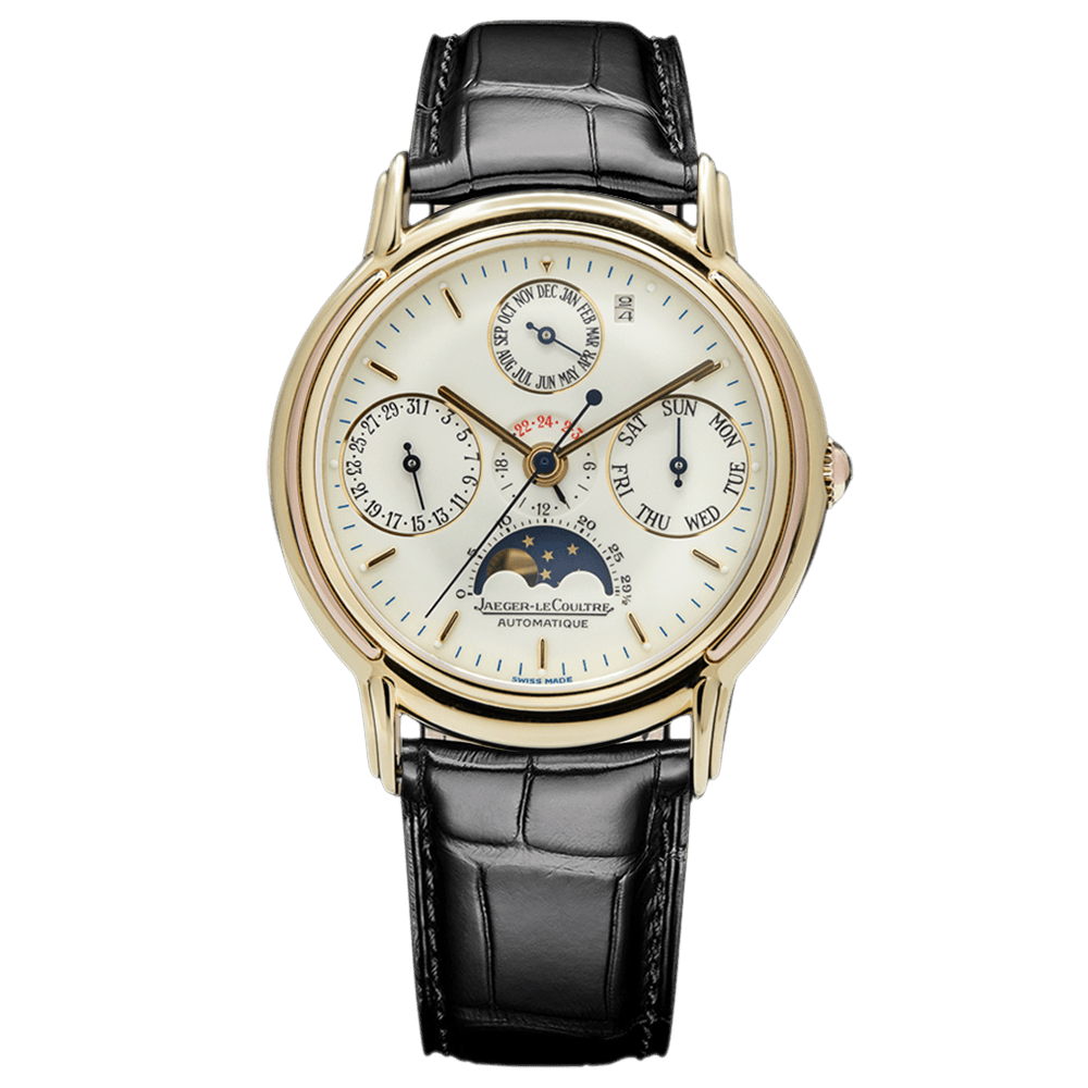 The Jaeger-LeCoultre Odysseus Perpetual Calendar Ref. 166.7.80 is a 35 mm 18 k yellow gold watch featuring a sleek white dial and automatic movement. Its perpetual calendar with moonphase elegantly tracks the day, date, month, year, and lunar cycle with precise, balanced indicator.