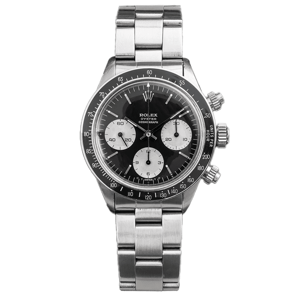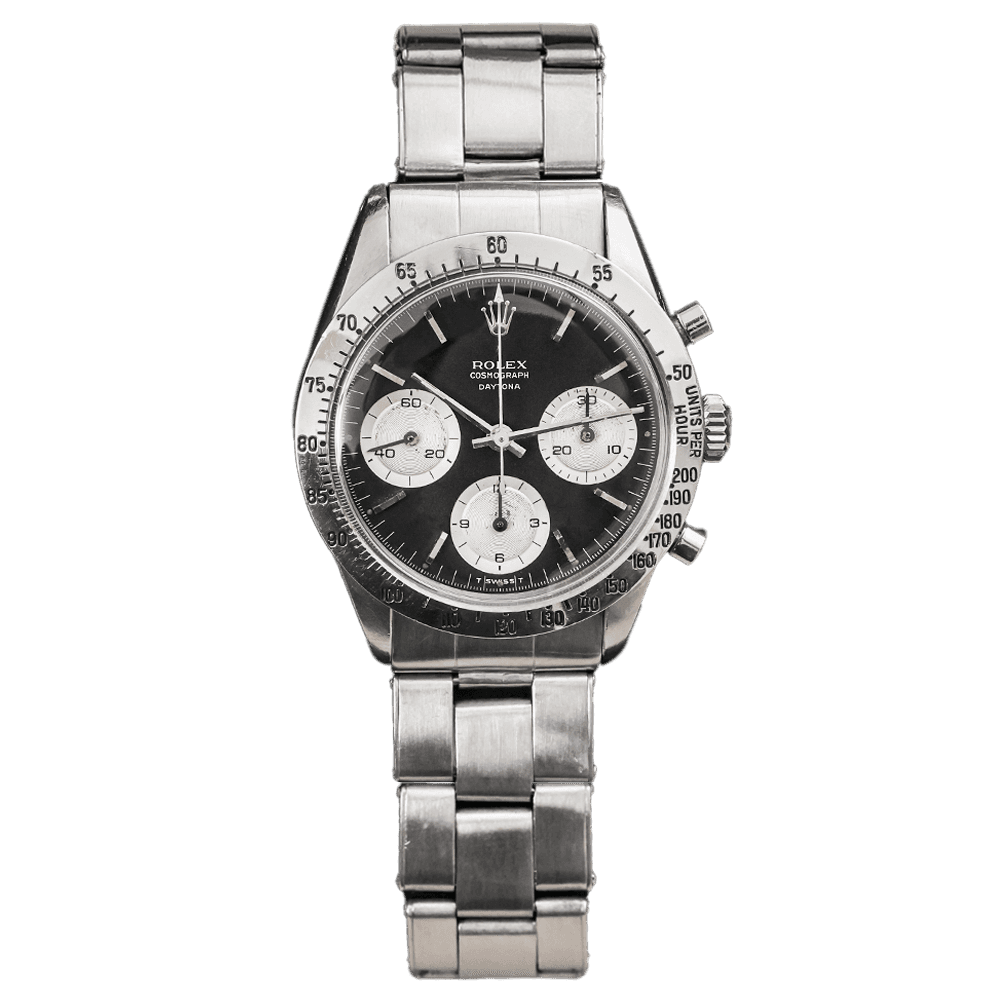 The Rolex Daytona Ref. 6239, a 36 mm stainless steel chronograph from 1966, is an iconic early Daytona featuring a black dial with contrasting sub-dials and a tachymeter bezel. Its manual-winding movement delivers precise chronograph performance, embodying the model’s enduring motorsport heritage and collectible appeal.